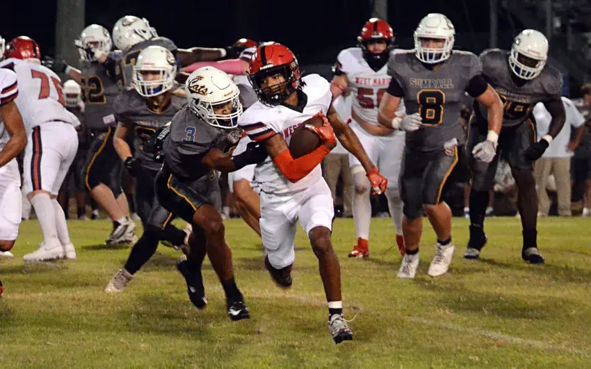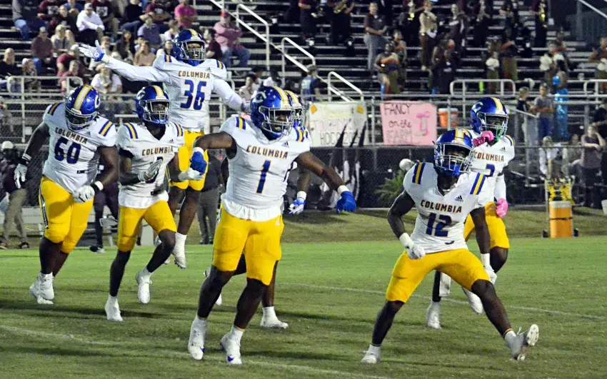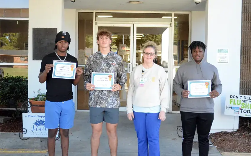 The Players of the Week for Week 9 are pictured with Anita Stringer, RN, of Marion General Hospital. They are, from left, East Marion's Caiden Belton, Columbia Academy's Reed Duncan and Columbia's Tra Lewis. Not pictured is West Marion's Jerqalin Boyd.