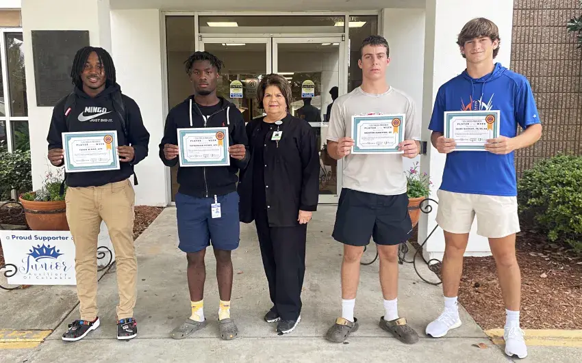 The Players of the Week for Week 2 are pictured with Jackie Stovall, Logistics Supervisor, of Marion General Hospital. They are, from left, East Marion's Caden Mingo, Columbia's Clydarrien Peters, West Marion's Braxton Albritton and Columbia Academy's Trent Buckley.
