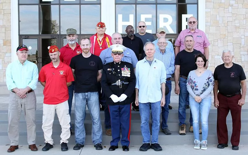 Local Marines celebrated the 248th birthday (Nov. 10) of the Marine Corps Nov. 9 at Seed’s Café where they were treated to a breakfast of eggs, bacon, biscuits and fellowship. Pictured, front row, from left, Tony Ortega, Charlie Sheely, Daniel English, Lt. Col.