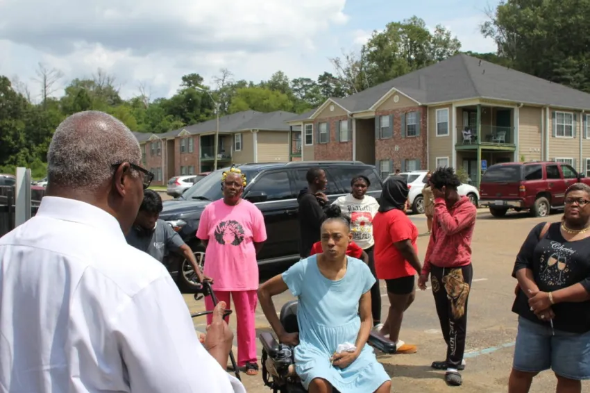 Jackson Police Chief Joe Wade, speaks with homeless individuals regarding recent legislation prohibiting squatting, encampments, and panhandling without a permit, at Stewpot, Thursday, July 3, 2025 in Jackson. Credit: Vickie D. King/Mississippi Today