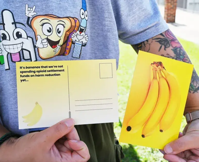 Brittany Denson, Save a Life Day state co-coordinator and organizer for Hinds County, with other volunteers, passes out naxolone and related items including these banana post cards, at St. Luke's United Methodist Church, Thursday, Sept. 25, 2025 in Jackson. Credit: Vickie D. King/Mississippi Today