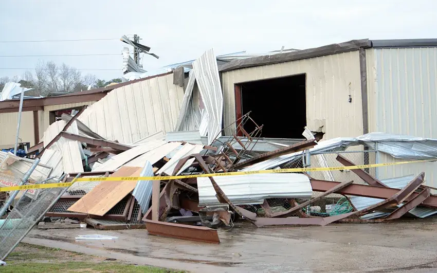 Beacon Supply suffered substantial damage Feb. 12 when an EF-0 tornado, which had max wind speeds of 85 miles per hour, hit the business. Three employees narrowly escaped the building pictured above. | Photo by Joshua Campbell © Emmerich Newspapers, Inc. 2025
