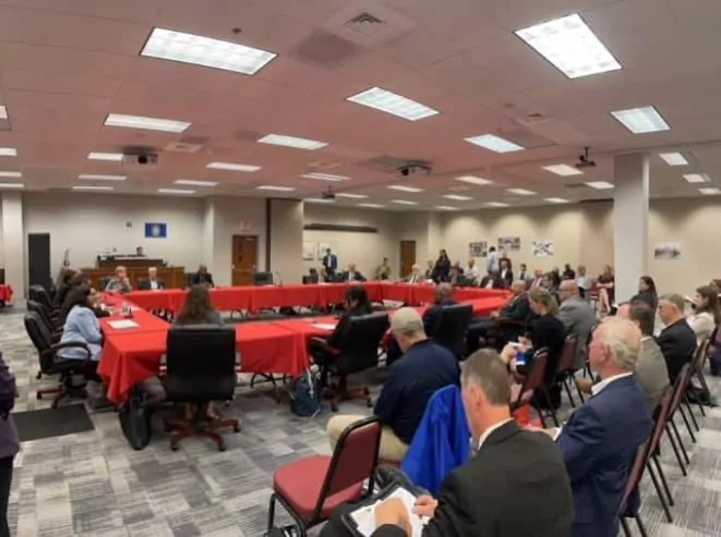 Ag Commissioner Andy Gipson, along with state and local law enforcement officials, addressed security staff and safety measures for the upcoming 2022 Mississippi State Fair. Pictured are officials representing the Mississippi State Fairgrounds, Mississippi Highway Patrol, Mississippi State Capitol Police, Department of Homeland Security, State Fire Marshal’s Office, Mississippi Department of Wildlife, Fisheries and Parks, Mississippi Agricultural and Livestock Theft Bureau, Hinds County Sheriff’s Office, and Jackson Police Department.