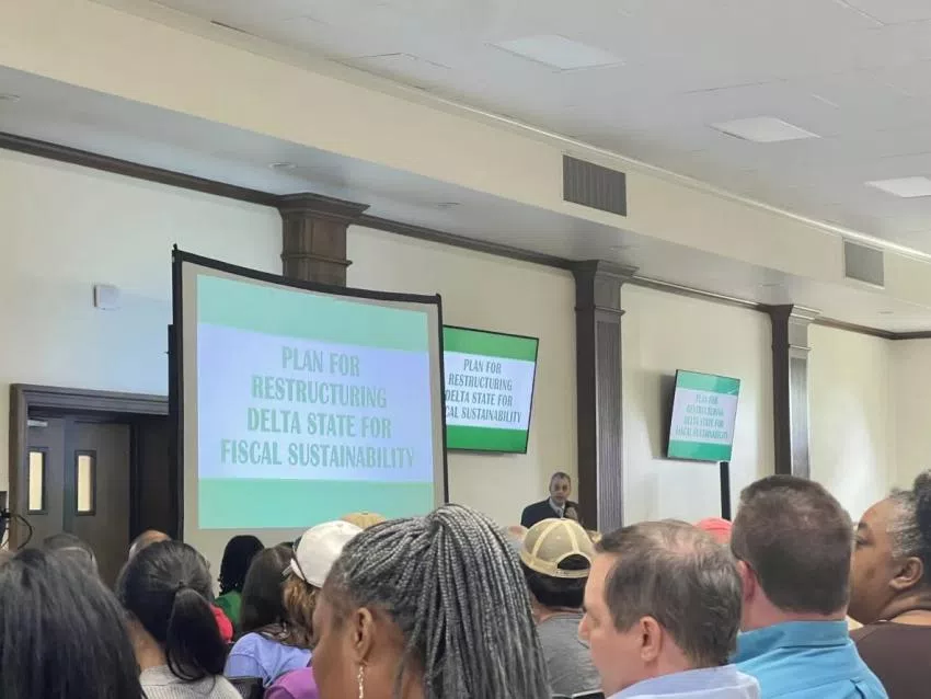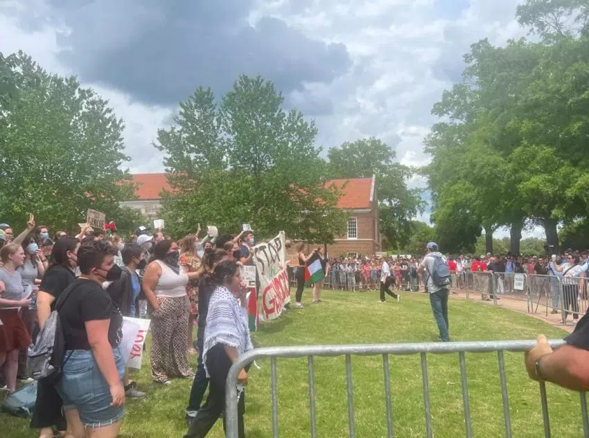 Protesters at the University of Mississippi in Oxford on May 2, 2024, joined the chorus of demonstrators at college campuses across the country calling for their administrations to divest any interest in businesses working with Israel in response to the nearly 35,000 Palestinian deaths in Israel's response to the deadly Hamas attack on Israel on Oct. 7, 2023. Credit: Molly Minta/Mississippi Today
