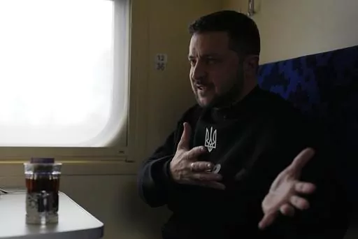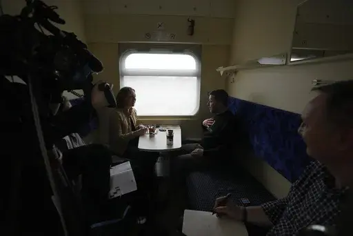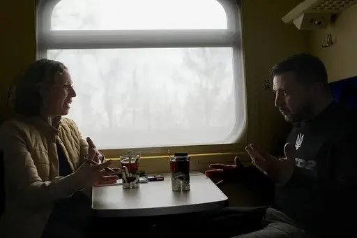 “Thank you that you are not meeting with me only in the capital," Zelenskyy tells journalists from The Associated Press who traveled with him on the train journey. “Thank you,” he says, that you "found such possibility to be in our places.”