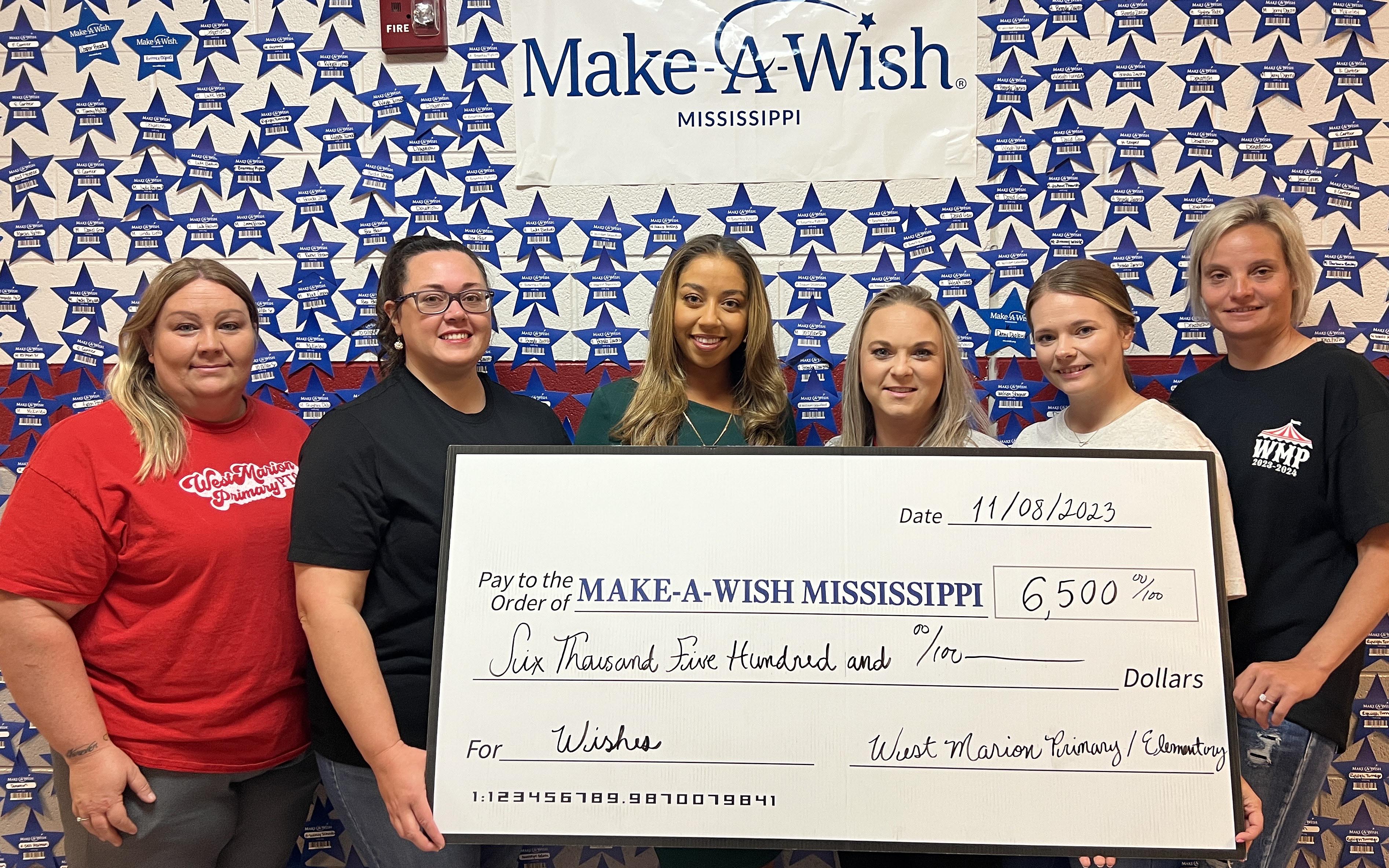 On Wednesday Nov. 8, 2023, West Marion Primary PTO and West Marion Elementary PTO were able to present a check to cover the full average cost of a single wish to Make-A-Wish Mississippi Volunteer Leticia Bezerra.