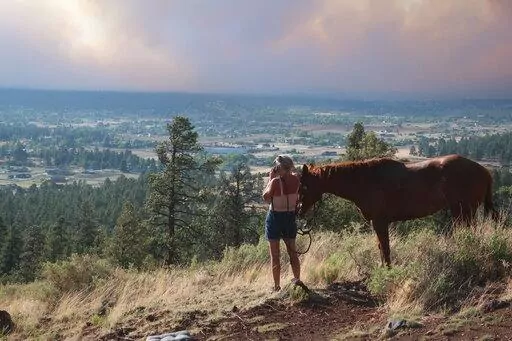 Flagstaff resident Janetta Kathleen rode her horse, Squish, up a hill to get a better look at the wildfire Sunday evening and watched it creep toward homes in the shadow of the mountain. Her home isn't directly in the fire's path, but her family, two bulldogs and horses are ready to go at a moment's notice.