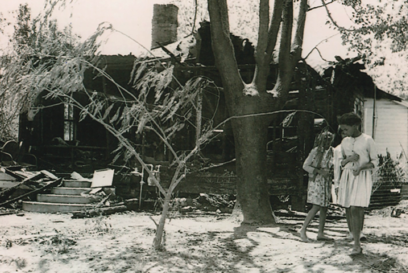 Though the flames had died down, Allen Cooper quietly photographed the ruins of Irene Magruder’s house. Using a camera concealed in a cardboard box with a small hole, he managed to keep it from being confiscated.