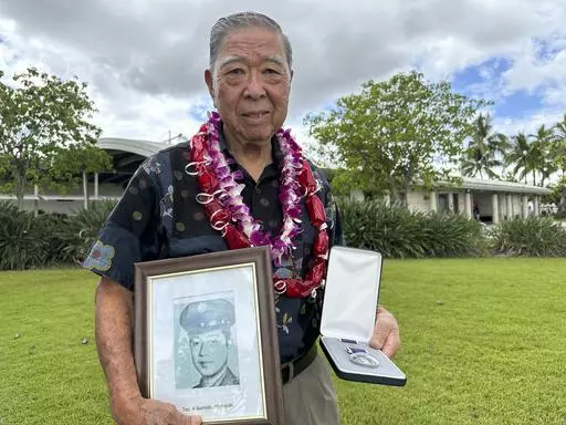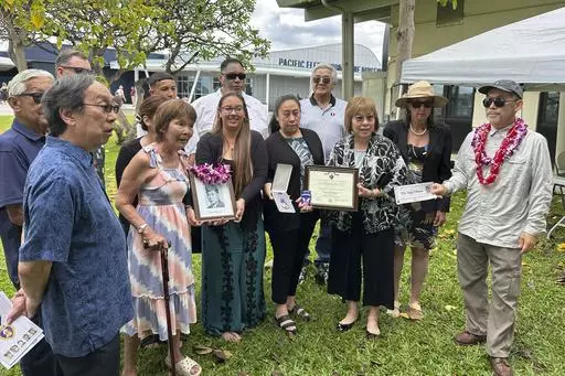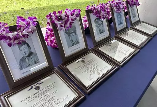 PEARL HARBOR, Hawaii (AP) — The families of five Hawaii men who served in a unit of Japanese-language linguists during World War II received posthumous Purple Heart medals on behalf of their loved ones on Friday, nearly eight decades after the soldiers died in a plane crash in the final days of the conflict.