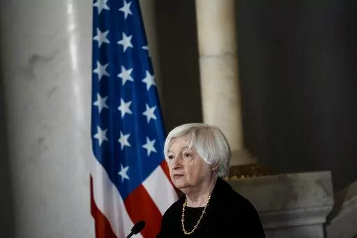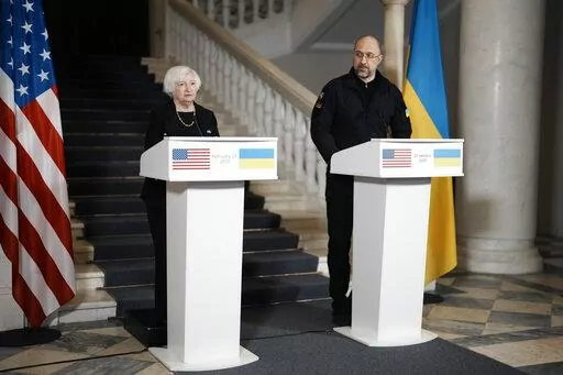 KYIV, Ukraine (AP) — U.S. Treasury Secretary Janet Yellen said Monday her first visit to Ukraine underscored Washington's commitment to continuing its economic support for the country, as the din of air raid sirens echoed across the Ukrainian capital.